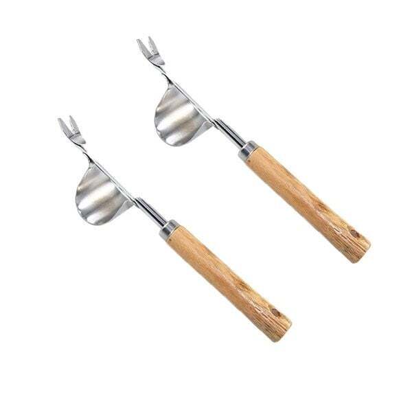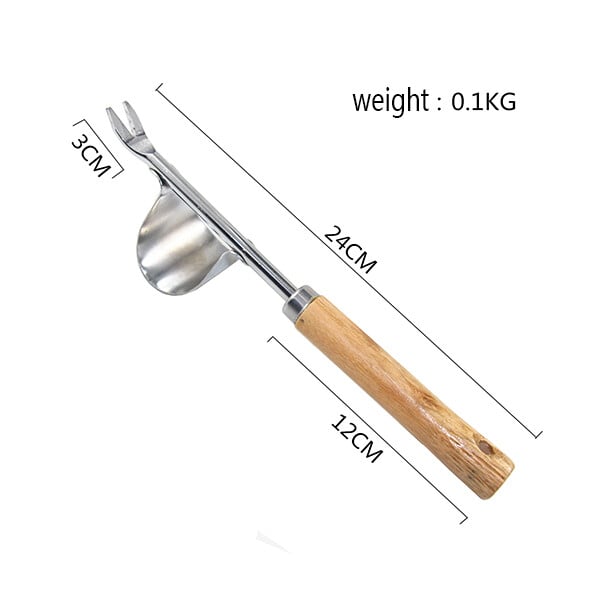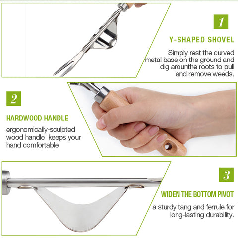 ① Y-SHAPED SHOVEL:Simply rest the curved metal base on the ground and dig arounthe roots to pull and remove weeds.