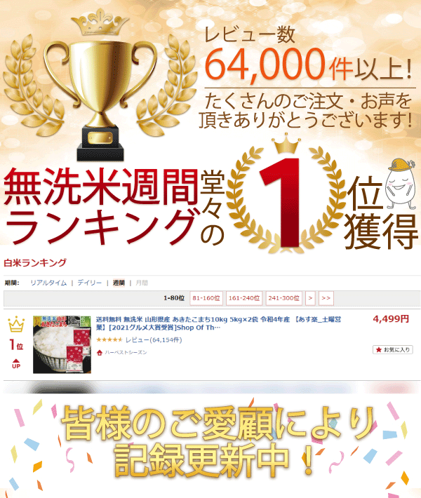 当店が販売させて頂いております無洗米については、品質重視と安全性重視の為に洗浄水を循環させず全てクリーンな水を使用して製造する方式を採用いたしております。特殊な薬品は一切、使用しておりませんので『一度も洗わずに炊いて頂ける無洗米』ではございますが、通常の精米商品や他の農作物同様、温度や湿度の高い場所で保管をすると虫の発生、品質の劣化を招くこともございます。※お米の袋は密閉状態ではなく、通気孔が設けられています。温度の高い場所を避け、涼しい場所等に保管をして頂けますよう、お客様にはご理解とご協力を何卒宜しくお願い申し上げます。※不正購入と判断した場合にはご注文を取り消しさせて頂く可能性がございます。※無洗米 山形県産 あきたこまち 10kg (5kg×2袋)